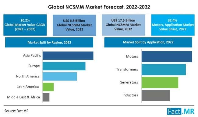 The market for soft magnetic Nanocrystalline Soft Magnetic Materials is expected to reach US$ 6.6 billion in 2022 and then grow at a CAGR of 10.2% to US$ 17.5 billion by the end of 2032. The auto industry is preparing to provide new growth opportunities to the market. The market for nanocrystalline soft magnetic materials refers to materials with nanoscale grain size that have excellent soft magnetic properties such as high permeability and low coercivity. These materials are commonly used in the production of electrical components like transformers, inductors, and motors.