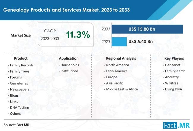 The market for genealogy goods and services is estimated to be worth US$ 5.4 billion globally in 2023 and is projected to grow rapidly to US$ 15.8 billion by the end of 2033. According to this thorough Fact.MR research analysis, sales of genealogy-related goods and services are expected to increase globally between 2023 and 2033 at an astounding 11.3% CAGR.