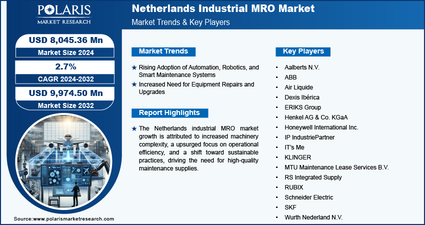 The Netherlands industrial MRO market size is expected to reach USD 9,974.50 million by 2032, exhibiting a CAGR of 2.7% during 2024–2032.