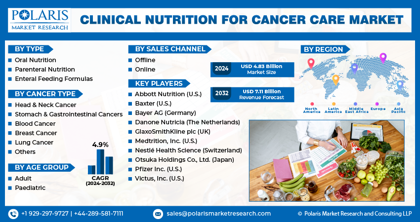 The global clinical nutrition for cancer care market size is expected to reach USD 7.11 billion by 2032, exhibiting the CAGR of 4.9% during the forecast period.