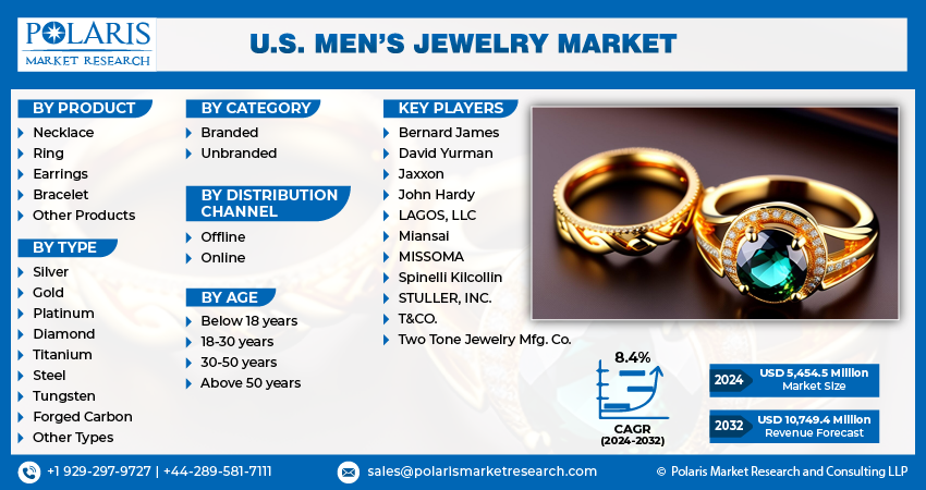The U.S. Men’s Jewelry market size is expected to reach USD 10,749.4 Million by 2032, exhibiting a CAGR of 8.4% during the forecast period