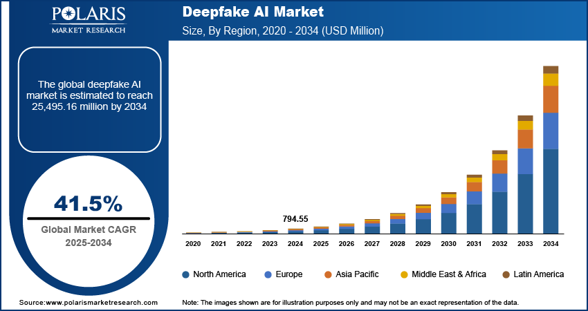 Global Deepfake AI Market size and share is currently valued at USD 794.55 million in 2024 and is anticipated to generate an estimated revenue of USD 25,495.16 million by 2034, according to the latest study by Polaris Market Research. Besides, the report notes that the market exhibits a robust 41.5% Compound Annual Growth Rate (CAGR) over the forecasted timeframe, 2025 – 2034