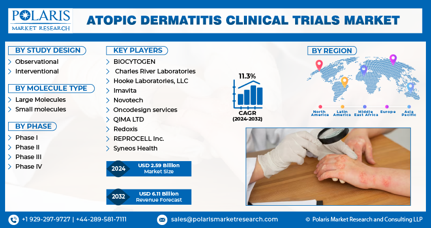 The global atopic dermatitis (AD) clinical trials market is experiencing substantial growth, driven by the increasing prevalence of this chronic skin condition and the ongoing development of novel therapies. With a projected market size of USD 6.11 billion by 2032 and a robust CAGR of 11.3%, the market reflects a significant investment in research and development aimed at improving treatment options for individuals with AD.