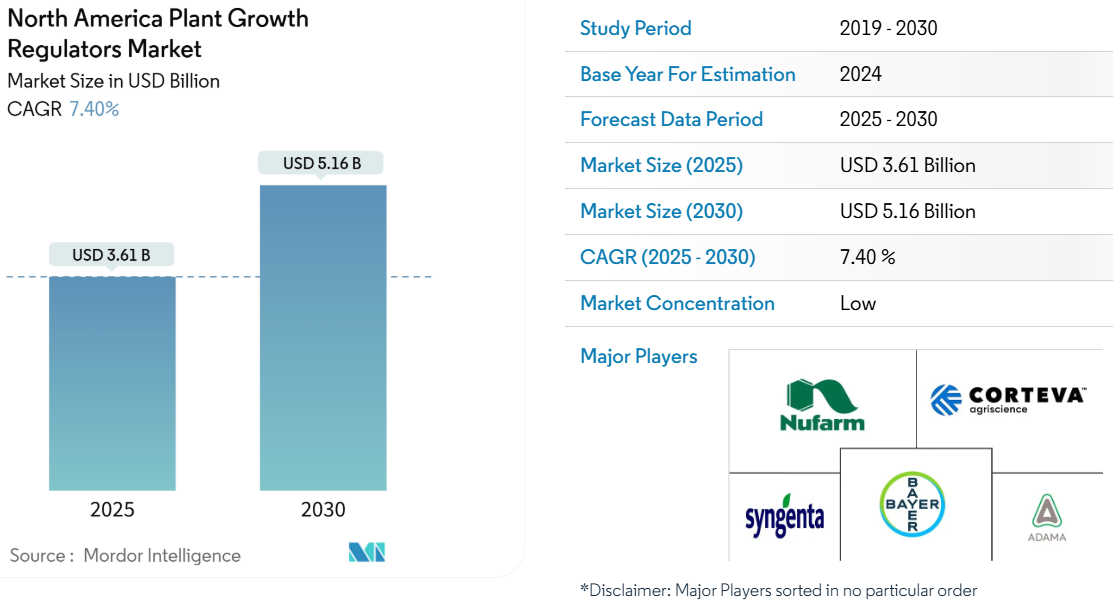 The North American Plant Growth Regulators (PGR) market is experiencing robust growth, propelled by the increasing adoption of sustainable agricultural practices and a rising demand for organic food products. PGRs are chemical substances that significantly influence plant growth and development, serving as vital tools in modern agriculture to enhance crop yields and quality. According to recent market analysis, the North American PGR market is projected to expand from USD 3.61 billion in 2025 to USD 5.16 billion by 2030, registering a compound annual growth rate (CAGR) of 7.40% during the forecast period.