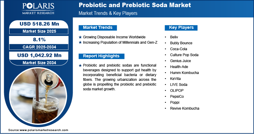 The global probiotic and prebiotic soda market has emerged as a dynamic and rapidly expanding segment within the functional beverage industry. Valued at USD 480.40 million in 2024, this market is projected to witness substantial growth, reaching an estimated USD 1,042.92 million by 2034. This progression reflects a robust compound annual growth rate (CAGR) of 8.1% over the forecast period (2025–2034).