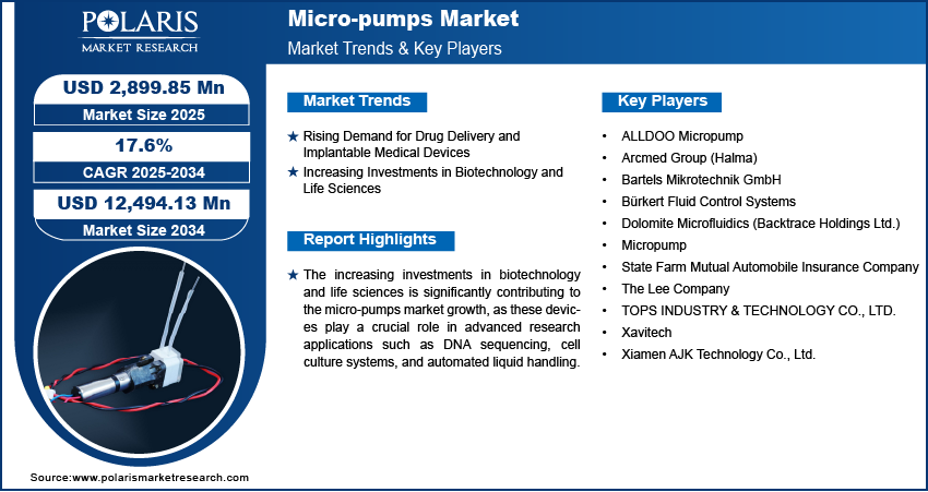 The global micro-pumps market size was valued at USD 2,466.49 million in 2024 and is expected to reach USD 2,899.85 million by 2025 and USD 12,494.13 million by 2034, exhibiting a CAGR of 17.6% during 2025–2034. Micro-pumps, which are small and highly efficient pumps used for fluid delivery in various applications, are becoming increasingly essential across a wide range of industries, including healthcare, automotive, chemical, and consumer electronics. These pumps are known for their precise fluid control capabilities, small size, and energy efficiency, which make them ideal for use in systems requiring controlled, low-flow pumping solutions.