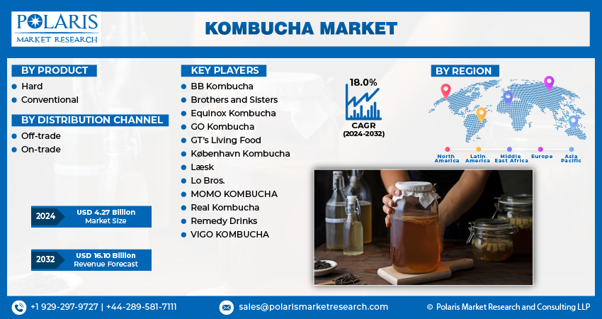 Global Kombucha Market size and share is currently valued at USD 3.63 billion in 2023 and is anticipated to generate an estimated revenue of USD 16.10 billion by 2032, according to the latest study by Polaris Market Research. Besides, the report notes that the market exhibits a robust 18.0% Compound Annual Growth Rate (CAGR) over the forecasted timeframe, 2024 – 2032