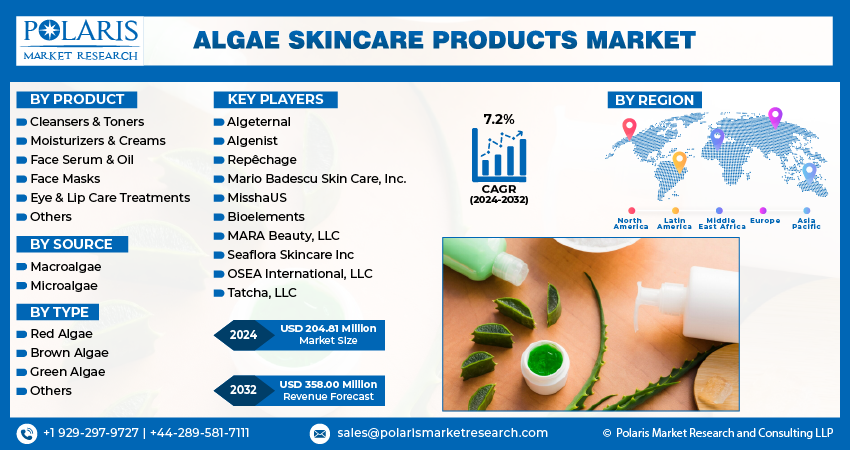 Global Algae Skincare Products Market size and share is currently valued at USD 198.48 million in 2023 and is anticipated to generate an estimated revenue of USD 358.00 million By 2032 according to the latest study by Polaris Market Research. Besides, the report notes that the market exhibits a robust 7.2% Compound Annual Growth Rate (CAGR) over the forecasted timeframe, 2024 – 2032