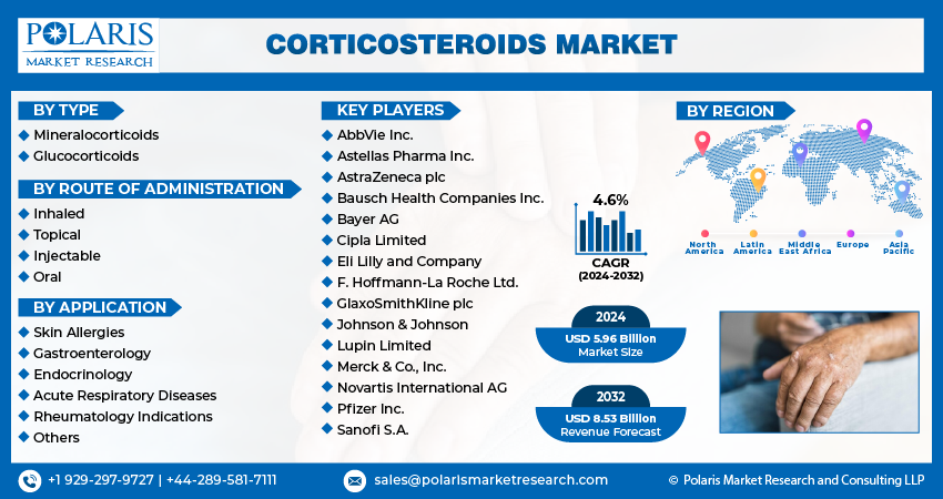 Global Corticosteroids Market size and share is currently valued at USD 5.96 billion in 2024 and is anticipated to generate an estimated revenue of USD 8.53 billion by 2032, according to the latest study by Polaris Market Research. Besides, the report notes that the market exhibits a robust 4.6% Compound Annual Growth Rate (CAGR) over the forecasted timeframe, 2024 – 2032