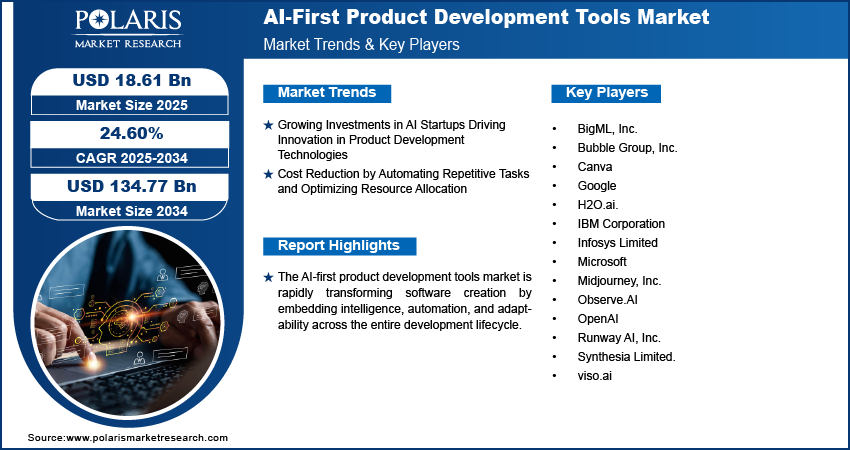 Global AI-First Product Development Tools Market size and share is currently valued at USD 15.01 billion in 2024 and is anticipated to generate an estimated revenue of USD 134.77 billion by 2034, according to the latest study by Polaris Market Research. Besides, the report notes that the market exhibits a robust 24.60% Compound Annual Growth Rate (CAGR) over the forecasted timeframe, 2025 – 2034