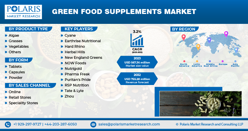 Global green food supplements market size and share is currently valued at USD 550.67 million in 2022 and is anticipated to generate an estimated revenue of USD 755.28 million by 2032, according to the latest study by Polaris Market Research. Besides, the report notes that the market exhibits a robust 3.2% Compound Annual Growth Rate (CAGR) over the forecasted timeframe, 2023 – 2032