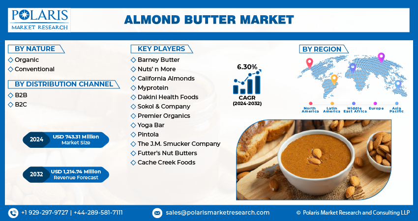 The Almond Butter Market is expected to reach $1,214.74 million by 2032, growing at a compound annual growth rate (CAGR) of 6.30%.