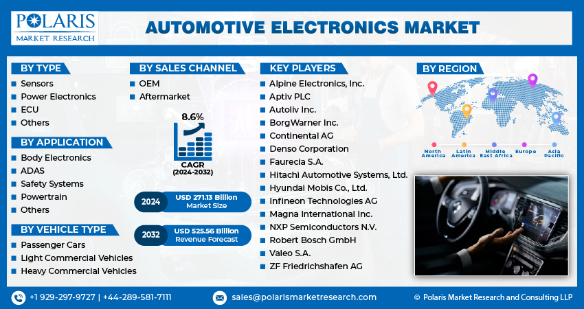The Automotive Electronics Market is projected to reach $525.56 billion by 2032, growing at a CAGR of 8.6%.